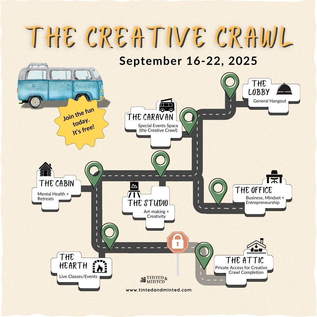 The Creative Crawl is a playful, self-paced 7-day event for artists, makers, and creatives of all kinds. Each day, you’ll enter a new ‘room’ inside The Minted Makers Co-op, unlock a spark of inspiration, and leave with fresh energy for your own creative practice.